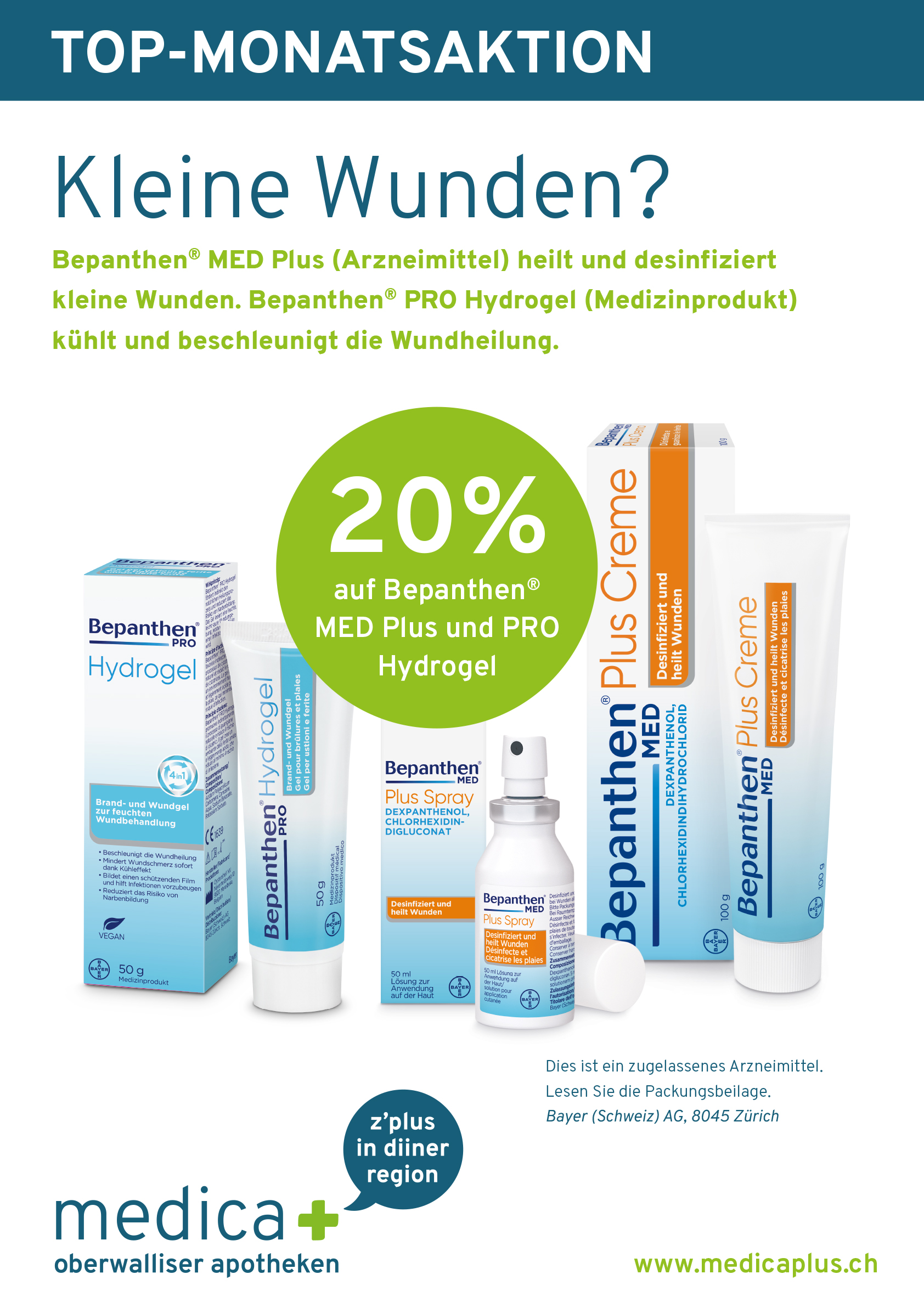 Profitieren Sie jetzt den ganzen Mai von 20% Rabatt auf die Bepanthen MED Plus und Bepanthen PRO Hydrogel. Gültig in allen MedicaPlus Apotheken.