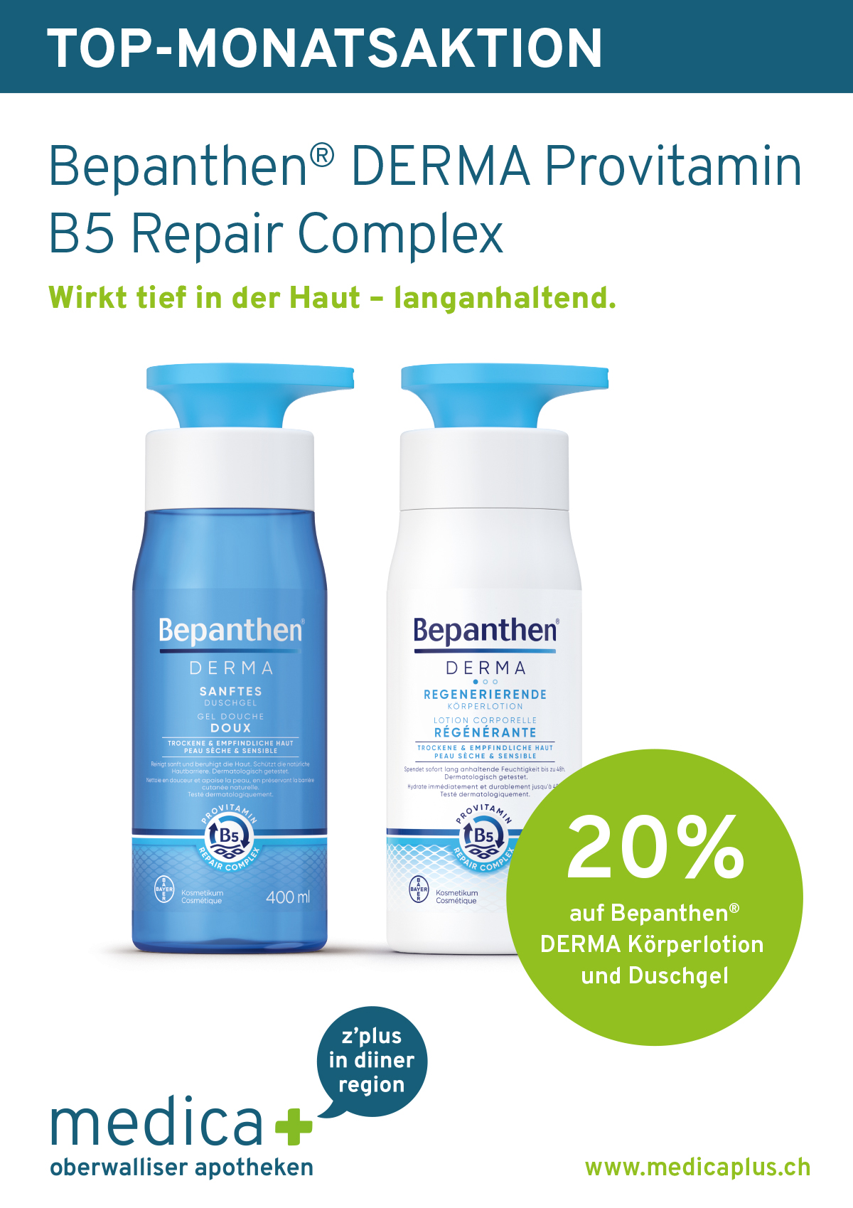 Unsere Monatsaktion zum Jahresbeginn 2024. Profitieren Sie jetzt von 20% Rabatt auf die Bepanthen DERMA Provitamin B5 Repair Complex. Gültig in allen MedicaPlus Apotheken.