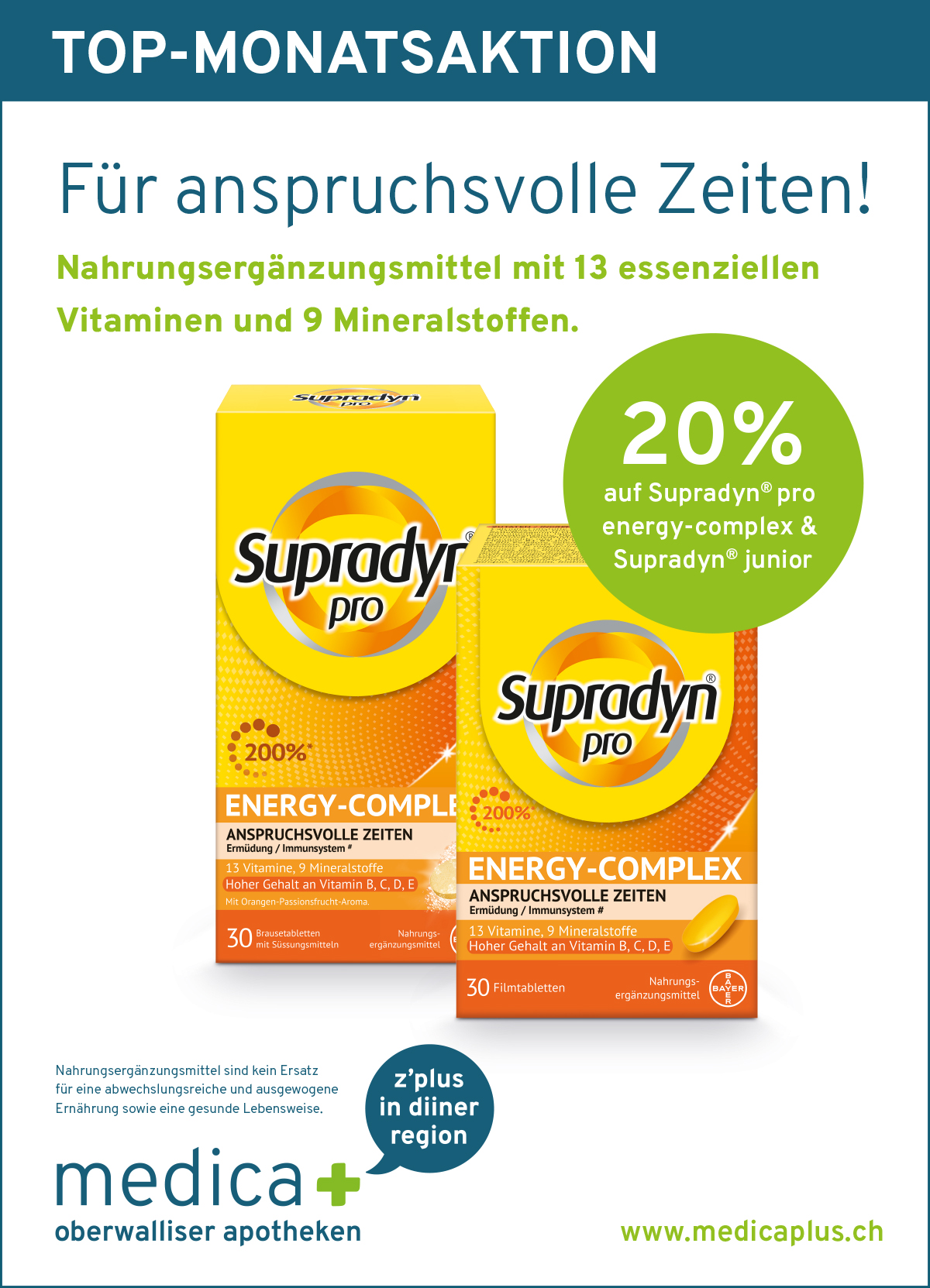 Monatsaktion im März: Profitieren Sie von 20% Rabatt auf die Supradyn pro energy-complex und Supradyn junior. Gültig in allen MedicaPlus Apotheken.
