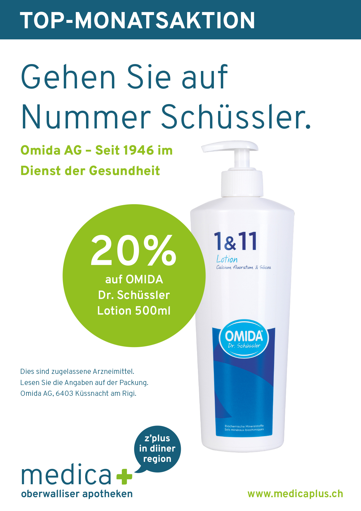 Unserer MedicaPlus-Monatsaktion im Februar. Profitieren Sie von 20%-Rabatt auf die Omida Dr.Schüssler Lotion 200ml/500ml. Gültig in allen MedicaPlus Apotheken.