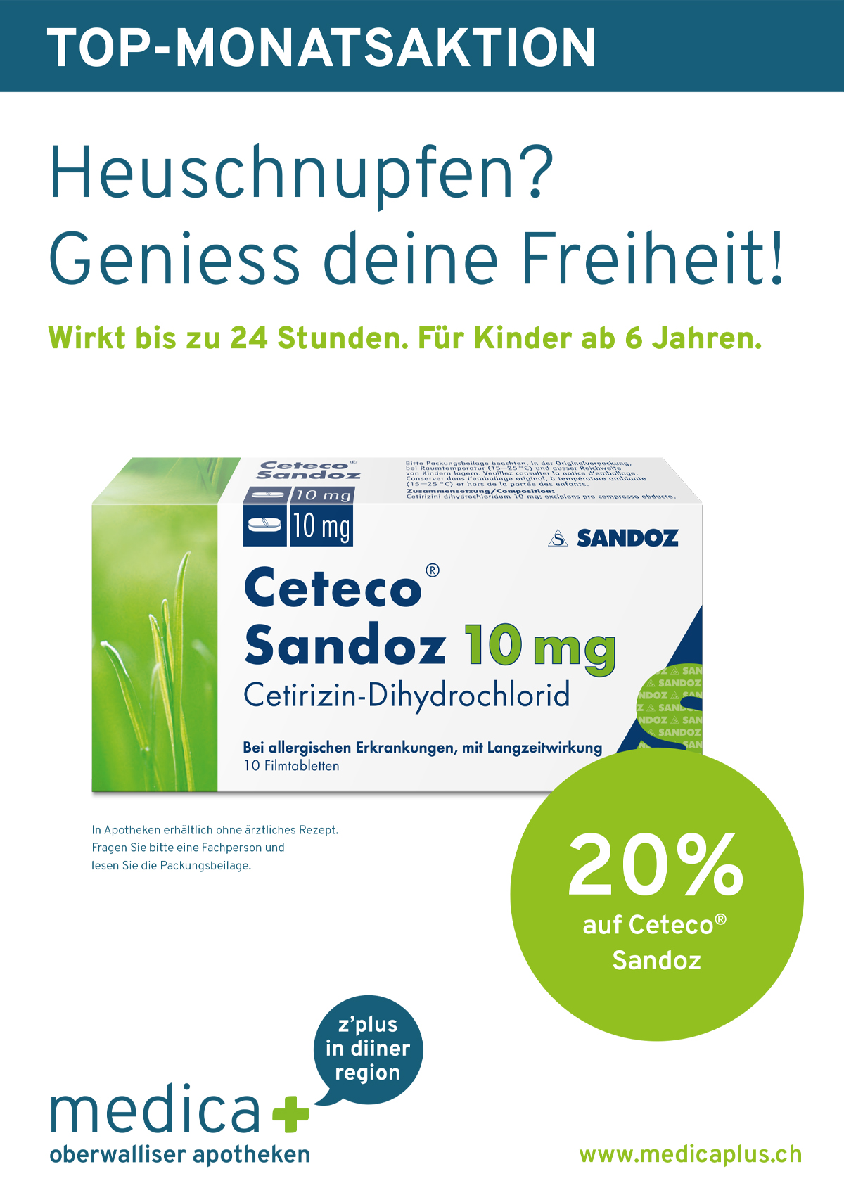 Profitieren Sie jetzt im Monat April von 20% Rabatt auf Ceteco Heuschnupfen Tabletten. Gültig in allen MedicaPlus Apotheken.