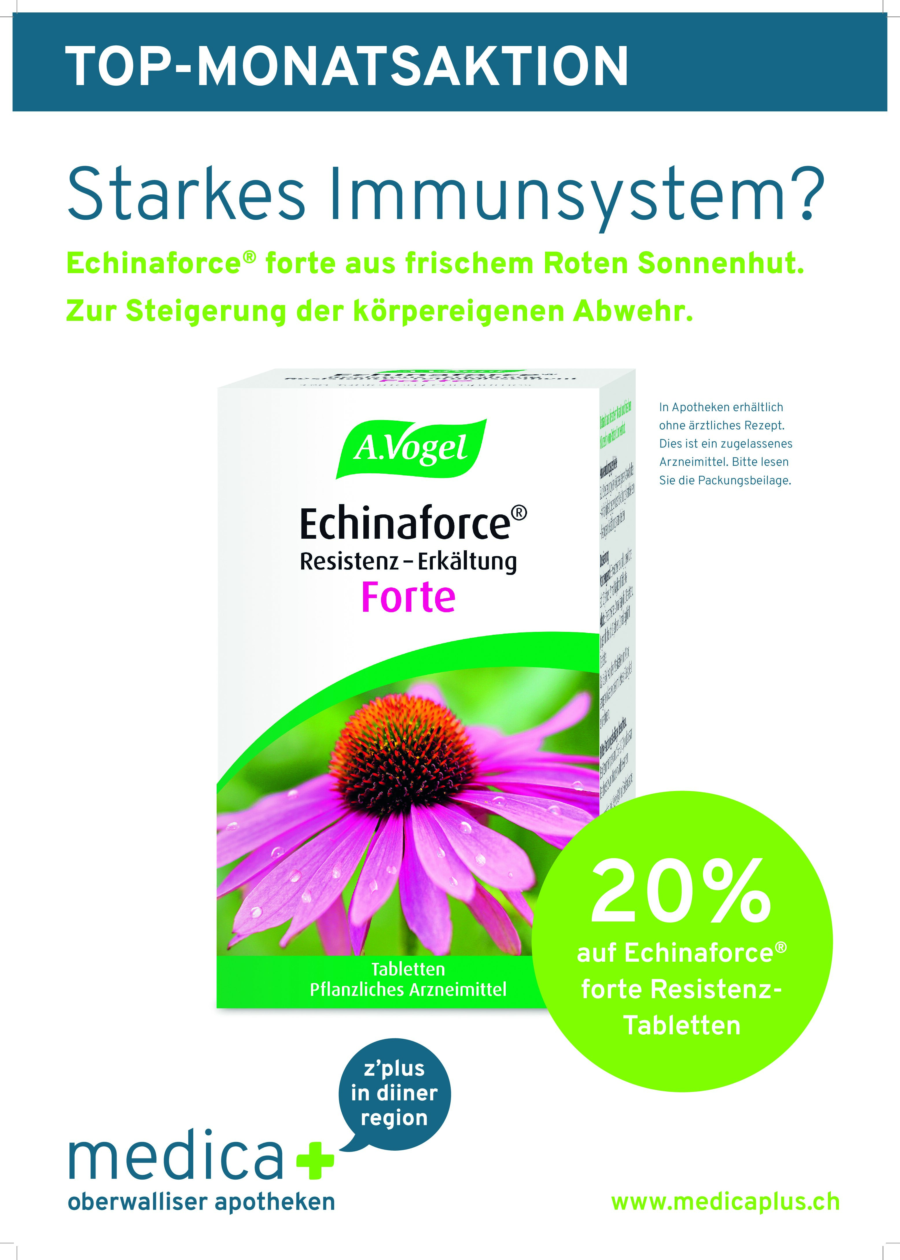 Unsere Monatsaktion im November: Profitieren Sie jetzt von 20% Rabatt auf die A.Vogel Echinaforce Forte Tabletten. Gültig in allen MedicaPlus Apotheken.